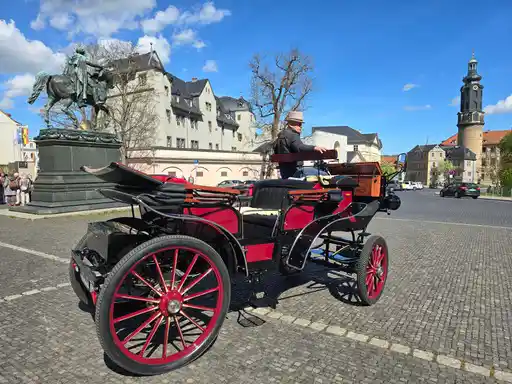 Einer der beliebtesten Anlässe für eine Kutschfahrt ist die Stadtrundfahrt durch Weimar. Während der Rundfahrt bei gemütlichem Tempo bietet sich Ihnen die Gelegenheit, die schöne Weimarer Altstadt sowie die zentral gelegenen Sehenswürdigkeiten in Weimar zu erkunden. Die offene Kutsche mit Verdeck erlaubt Ihnen während der Fahrt den ungetrübten auf die Schönheiten, welche die Stadt Weimar zu bieten hat.
